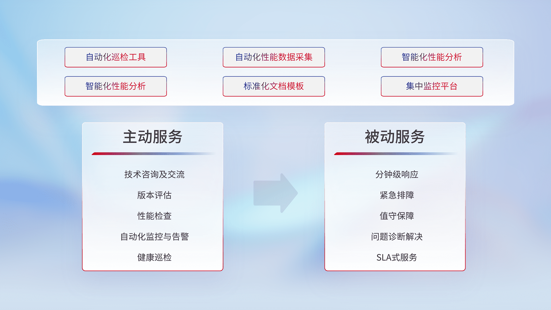 智能化工具和标准化文档,,保障服务质量,,,,提供主动服务(包含技术咨询、、、、版本评估、、、、性能检查、、、、自动化监控与告警、、健康巡检)和被动服务包含(分钟级响应、、、紧急排障、、、值守保障、、、问题诊断解决、、、、SLA服务)。。