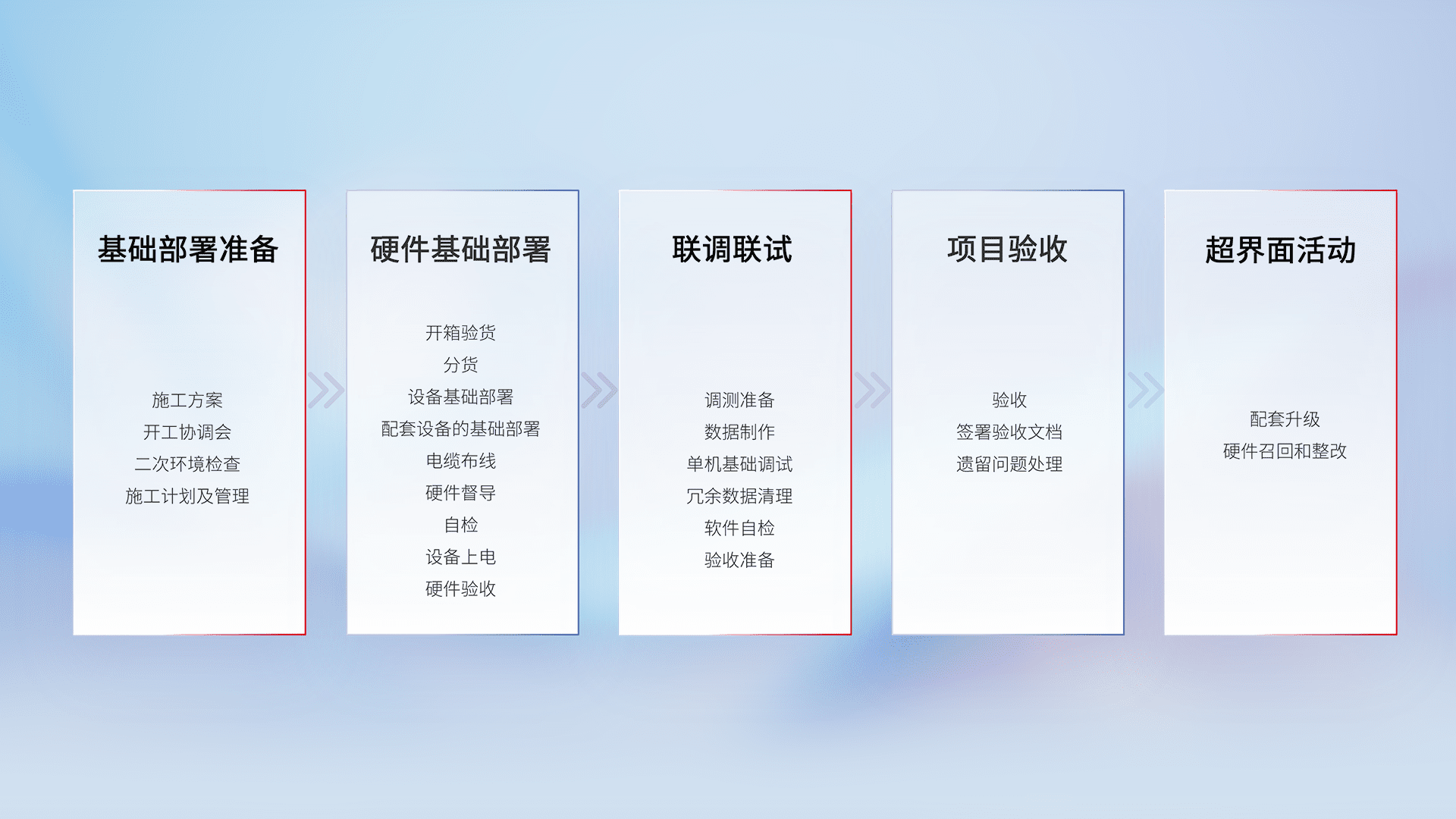 从基础部署准备、、、、硬件基础部署、、、联调联试、、、项目验收、、、、越界面活动的全过程可追溯,,保证施工质量和进度。。。。