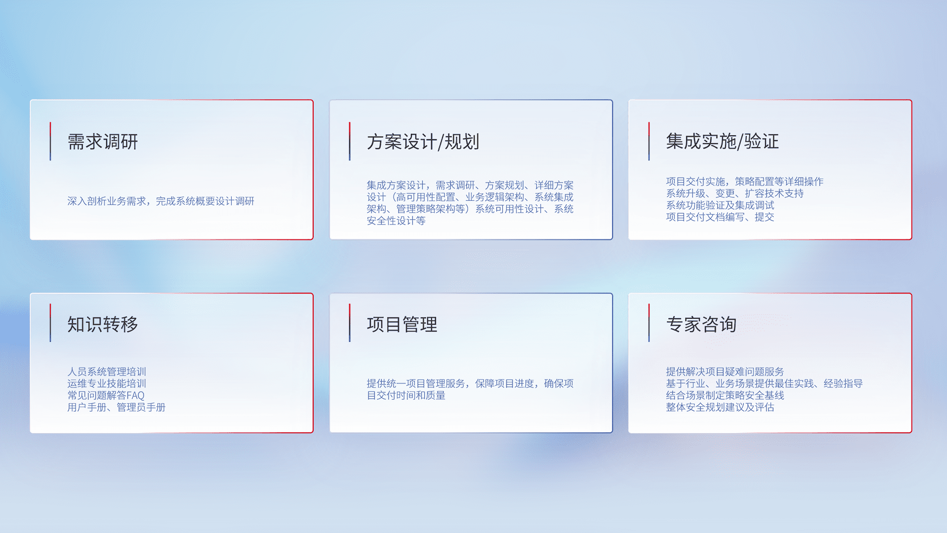 针对客户行业特性,,,,将宏观的安全战略和需求,,通过专业的交付服务,,实现项目落地,,为客户提供标准规范的集成交付服务。。。